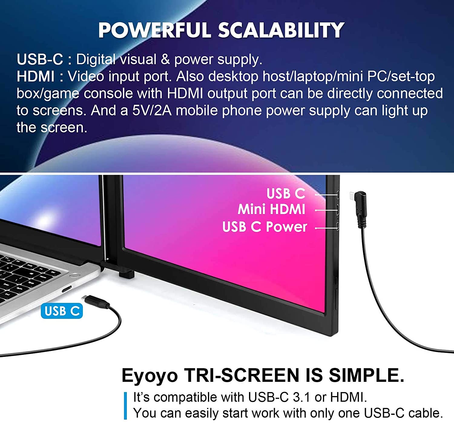 • 【Extend your Laptop to Triple Screen】 The extended screen is a versatile, easy-to-use mobile dual-screen monitor! It provides you with more space to operate on your computer. Just plug in the USB-C cable and start working right away.